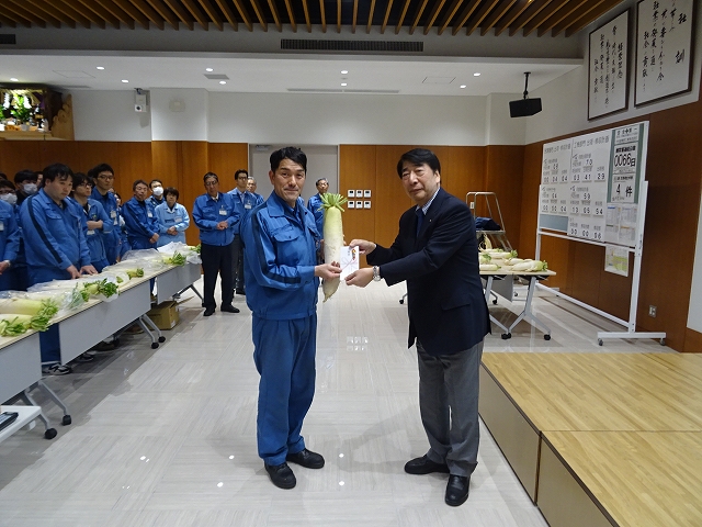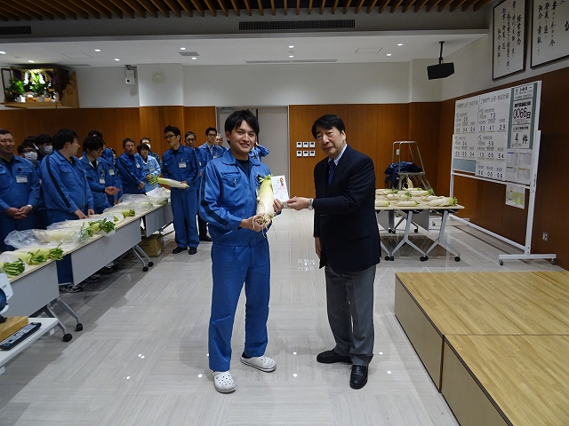 ひねりがきれいなダイコンを作った総務部は、おもしろダイコン賞に選ばれました。